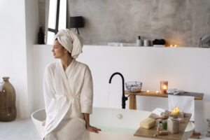 Instead of just a purely functional area for cleansing, make your bathroom also a place for restoration. This is where your morning ritual stretches at a leisurely pace, and evening soaks become a daily habit. Have a cozy chair that invites you beside a minimalist shelf of updated light reading materials and a potted eucalyptus with its distinct aroma. Here, you don’t just escape reality but return to the outside world refreshed.